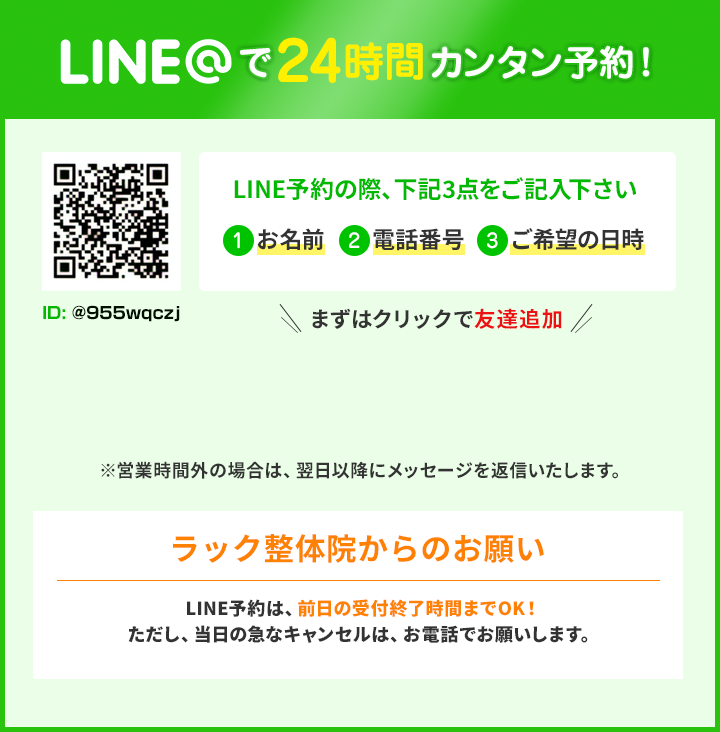 お悩みを本気で改善したい方は、ぜひラック整体院を訪ねみてください。